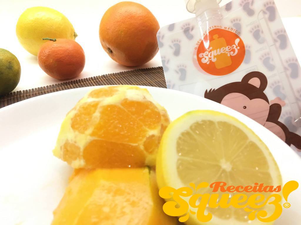 É simples, nós usamos qualquer fruta que seja da família dos citrinos, ou o limão, toranja, clementina, laranja... sendo que a laranja é a mais usada para cozermos a fruta (ao invés da água) durando assim até 6 dias nos pacotinhos Squeez ! Se não tiver nenhuma fruta doce poderá colocar água com gotas de limão. A outra questão é a partir de que meses... Isso irá depender do vosso filho e da permissão da pediatra (depende muito de pediatra para pediatra e das alergias que os pequenos possam ter).