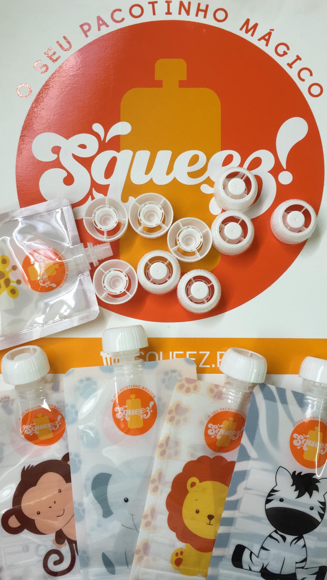 São pacotinhos reutilizáveis (100ml,150ml e 200ml) que servem para levar purés de fruta, batidos, iogurtes e sumos naturais mais espessos, sopas e afins que pode comprar em www.squeez.pt