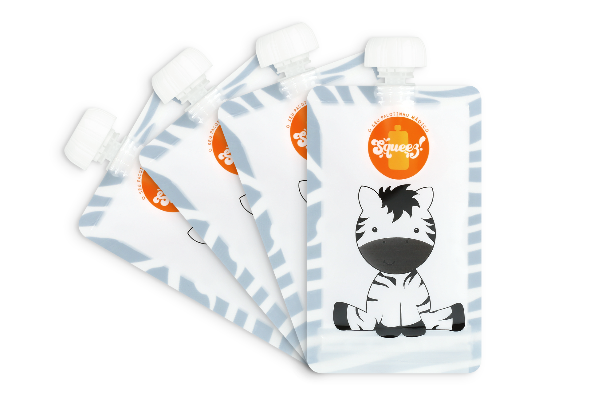 • Embalaens de alimentos líquididos reutilizáveis com desenho de zebra e texto Squeez