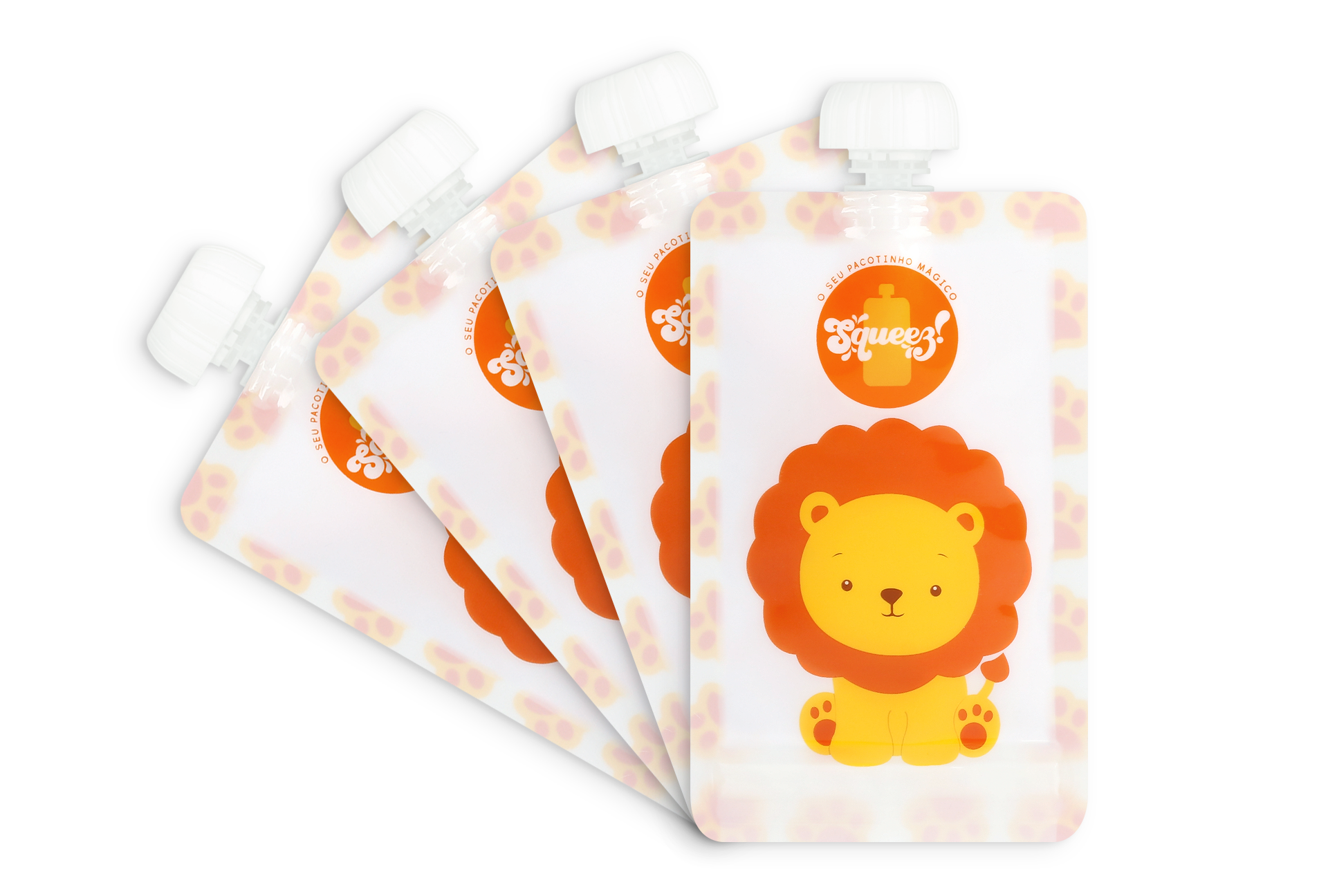 • Quatro embalagens flexíveis com estampado de leão e tampa branca.